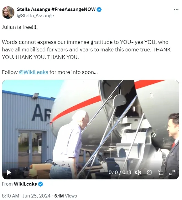 当地时间25日,朱利安·阿桑奇的妻子斯特拉在社交媒体上激动地写道,“言语无法表达我们对你们的感激之情——是的,就是你们,多年来,你们一直努力让这一切成为现实。谢谢你们。谢谢你们,谢谢你们。”