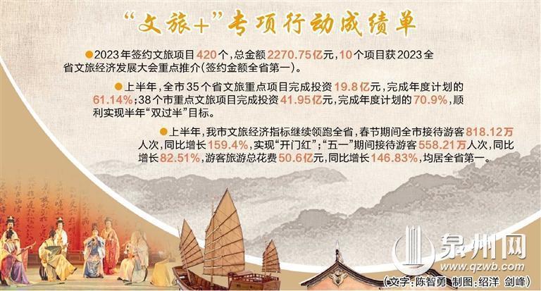 “文旅+”让泉州城市火爆“出圈”,为泉州文旅描绘“繁花似锦”新图景。2023年7月,我市印发《泉州市“文旅+”2023年专项行动方案》,明确目标任务和时间表,成立泉州市“文旅+”专项行动领导小组,深入实施“文旅+”专项行动,交出了一份满意的答卷。