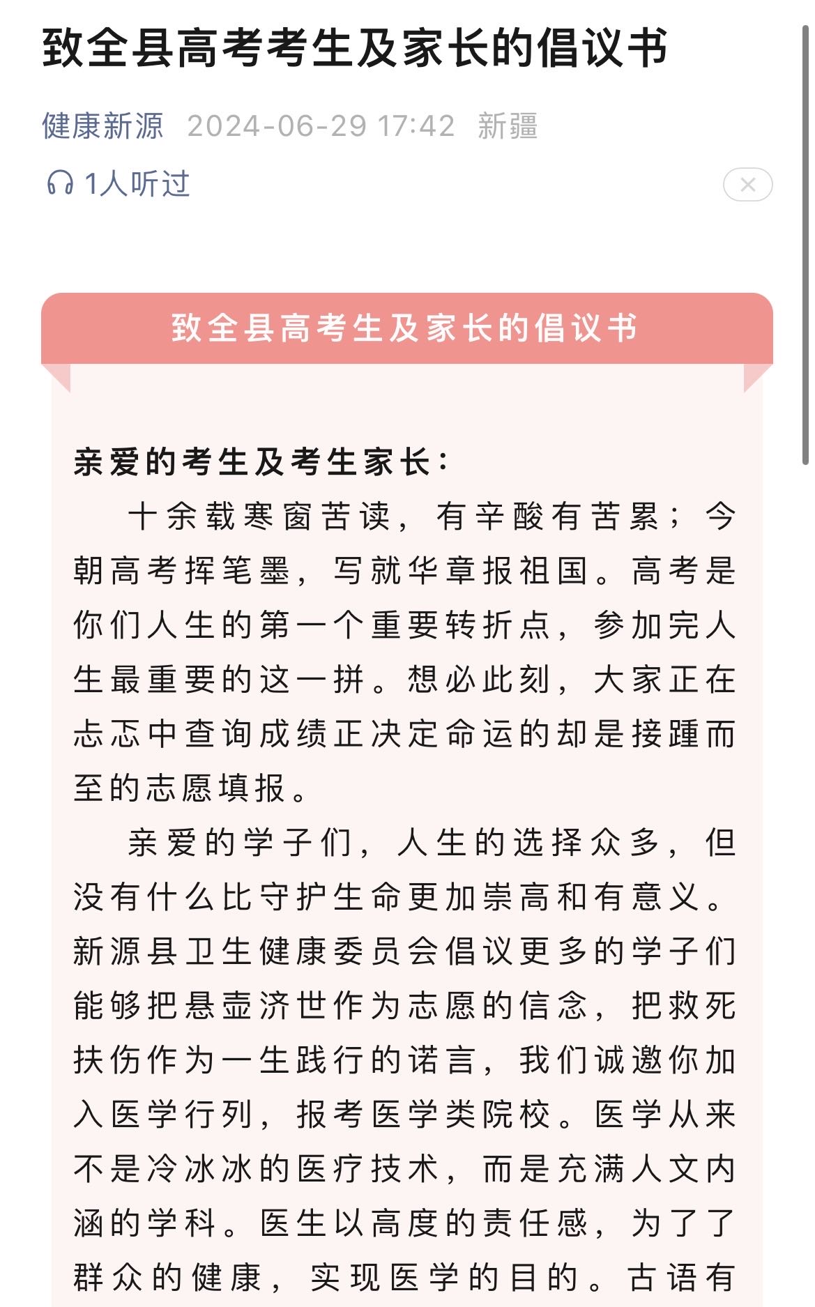 6月29日,新疆新源县卫生健康委员会也发布倡议书称,医学专业学科人才奇缺,选择合适的院校专业尤为关键,倡议广大学子考虑报考医学类院校,为新源人民的健康共同努力。