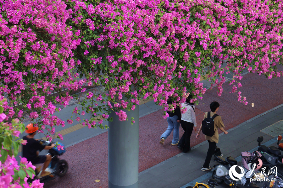 天桥上的三角梅花团锦簇,宛如瀑布倾泻而下。人民网记者 陈博摄