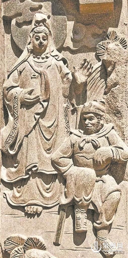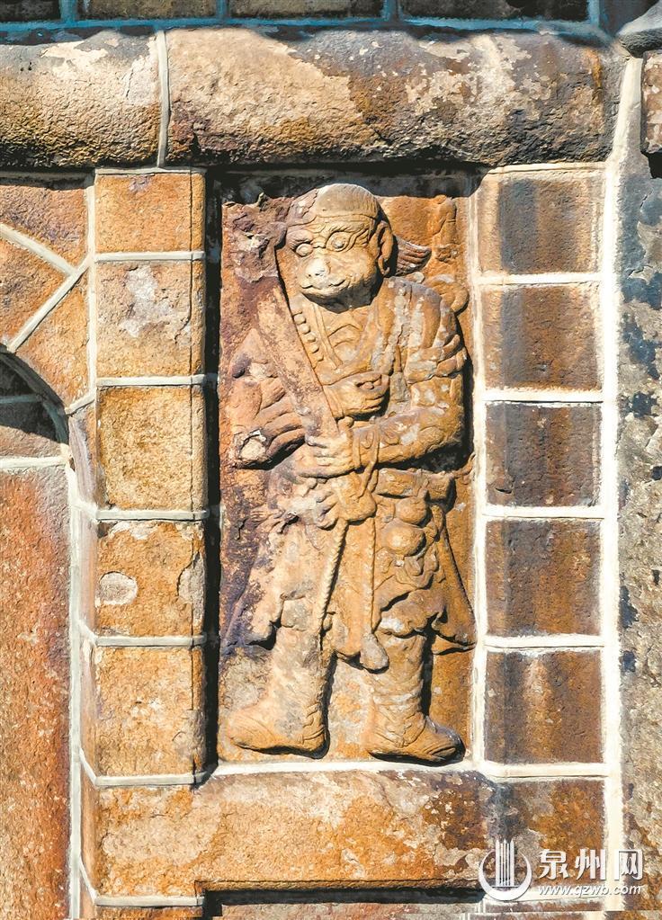 第一站:游泉州开元寺探寻悟空的“前世今生”。泉州开元寺为福建省规模最大的佛教寺院,唐代桑莲古树、北宋甘露戒坛、东西双塔皆盛名在外。东西塔是镇国塔、仁寿塔的合称,为中国最高孪生石塔。在西塔四层,有一尊雕像尤其引人注目——“猴行者”。猴行者尖嘴鼓腮,头戴金箍,左手执一把戒刀,右手曲于胸前,手指捻着胸前的念珠,腰间系有一卷《孔雀王咒》和一只宝葫芦,浮雕右上角刻有“猴行者”三字。东塔上也有玄奘和猴行者的身影,在二层的西北面。玄奘浮雕身后有圆光,左手持念珠,他的左下角也有一尊小小的猴头人身的“猴行者”浮雕。