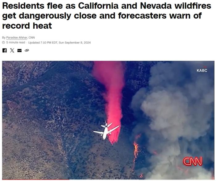 中新网9月9日电 据美国有线电视新闻网(CNN)8日报道,连日来,美国加利福尼亚州和内华达州的野火肆虐,截至当地时间8日,大火已烧毁近1.8万英亩土地,加州近5000户家庭紧急撤离。