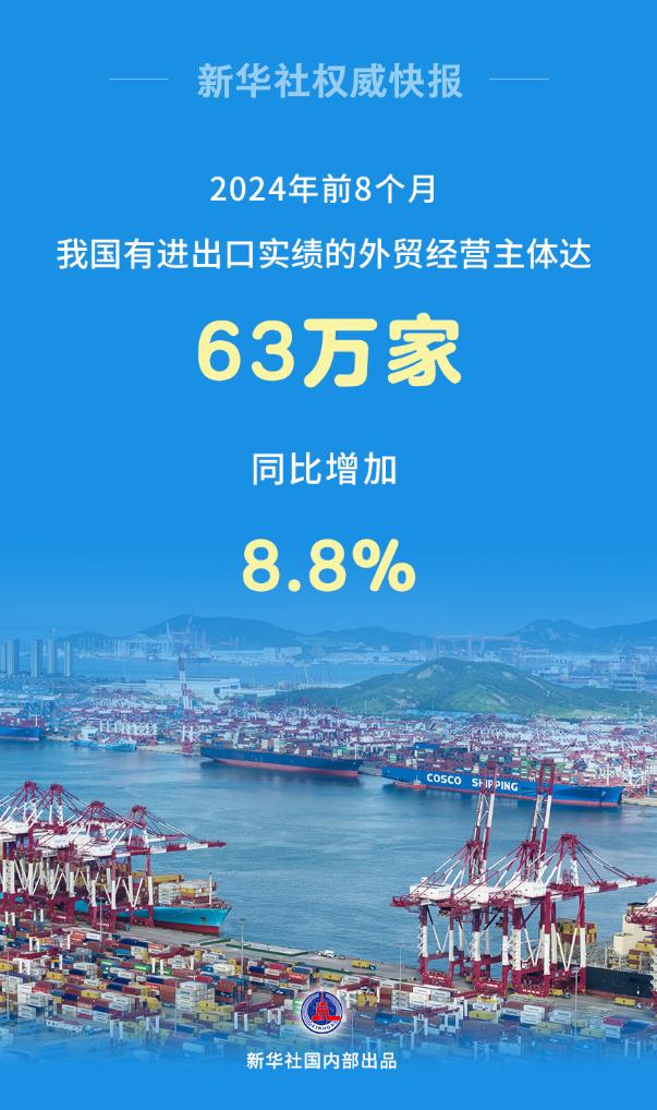 9月10日海关总署发布2024年前8个月外贸数据 据海关统计我国外贸经营主体持续活跃前8个月有进出口实绩的外贸经营主体达63万家同比增加8.8%其中,外贸主力军民营企业进出口15.74万亿元 此外,数据还显示前8个月,我国货物贸易保持增长进出口总值28.58万亿元,同比增长6%其中出口16.45万亿元,同比增长6.9%进口12.13万亿元,同比增长4.7% 记者:邹多为、魏弘毅设计:苗夏阳新华社国内部出品 上一篇 下一篇