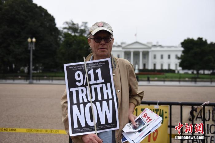 资料图:当地时间2018年9月11日,美国民众在白宫门前呼吁调查“9·11”事件真相。中新社记者 邓敏 摄