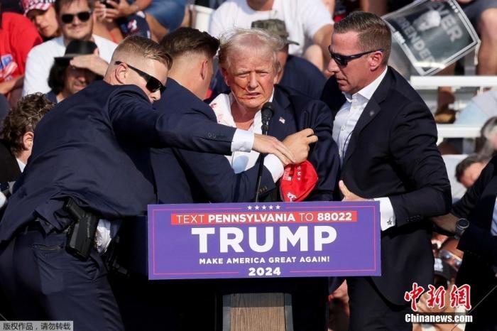 综合外媒消息,当地时间7月13日下午,美国前总统特朗普在宾夕法尼亚州举行竞选集会发表演讲时,现场响起枪声。图为特朗普在特勤人员保护下撤离演讲台。