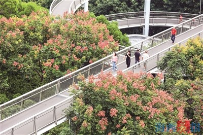 市民游客来到山海健康步道,欣赏台湾栾树美景。记者 陈理杰 摄