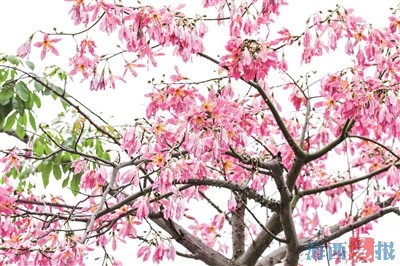 据了解,美丽异木棉,又称“美人树”,是优秀的秋冬观花乔木,盛花期主要集中在每年10月至12月。与一般落叶乔木不同,美人树具有先落叶后开花的特点,当花期来临时,只见满树粉黛如云如霞,与蓝天白云交相辉映,美不胜收。