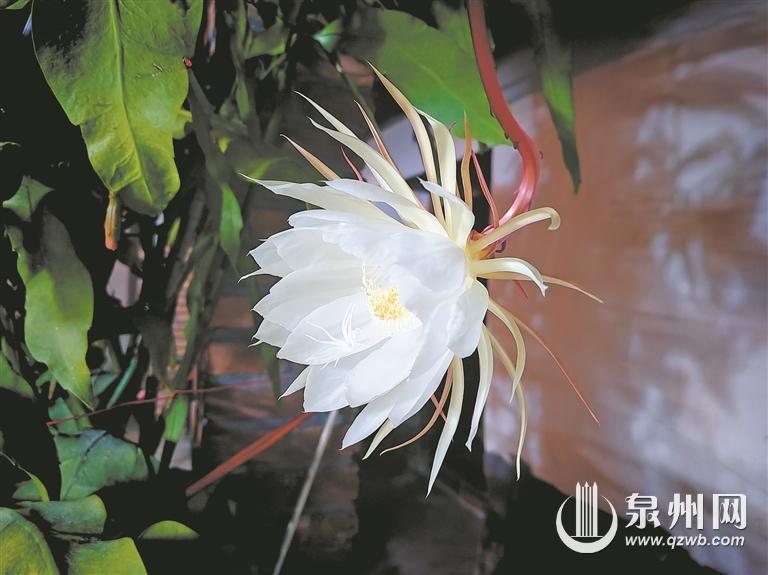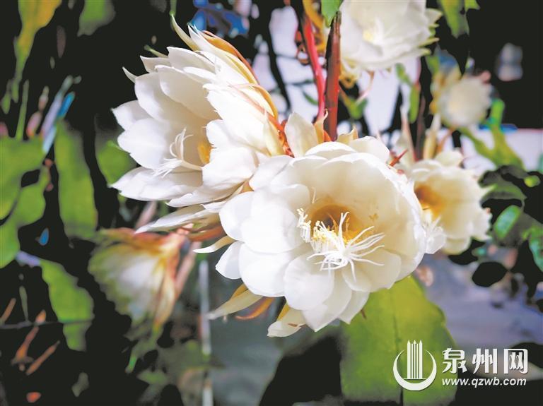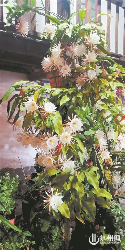 走进曾女士家的院子,一株两米多高的昙花映入眼帘,肥厚的叶子一片片垂下,浅粉棕色的花苞熙攘层叠地藏在其中。在弯曲花茎的有力支撑下,花苞努力向上鼓着,张开洁白的小口,微微散发着清香。