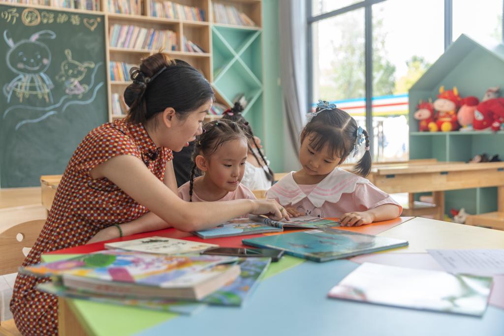 2024年9月25日,在重庆市江津区珞璜镇碑亭社区,社区居民郭明会(左一)带着小孩阅读用社保卡借阅的图书。新华社记者 黄伟 摄
