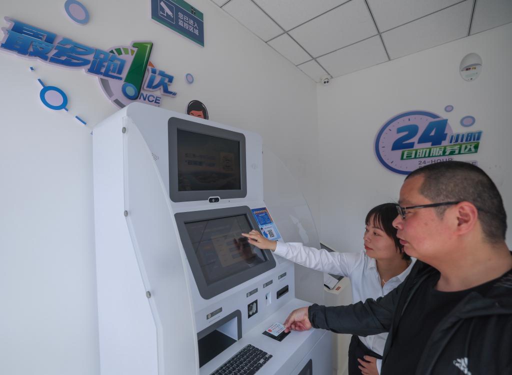 2024年5月9日,在浙江省嘉兴市秀洲区王江泾镇便民服务中心,工作人员指导居民对在苏州工作期间的社保缴费记录进行自助跨省查询。新华社记者 徐昱 摄