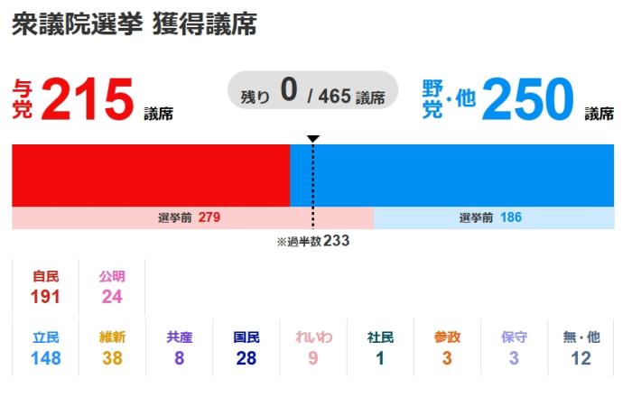 此次选举后,自民党和公明党组成的执政联盟在国会的席位,从此前的279席大幅缩减至215席,失掉多数地位。