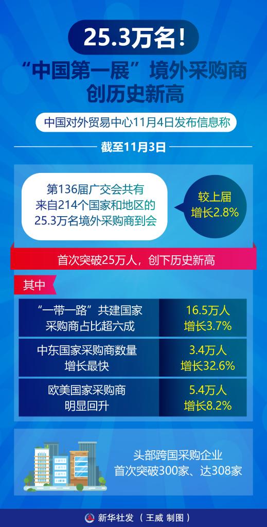 新华社广州11月4日电(记者丁乐、洪泽华)中国对外贸易中心4日发布信息称,第136届广交会共有25.3万名境外采购商到会,首次突破25万人,创下历史新高,头部跨国采购企业首次突破300家、达308家。