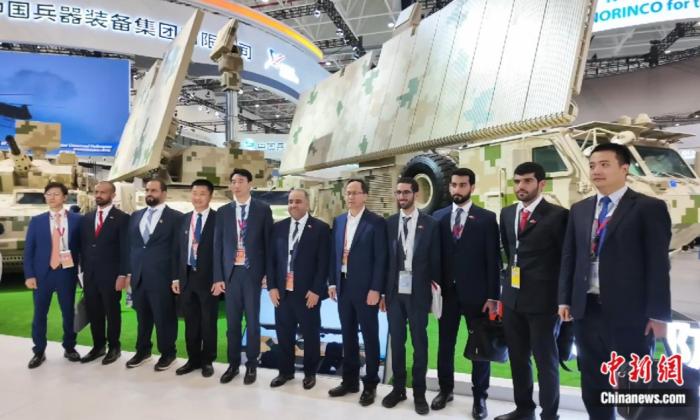 中外宾客在高功率微波武器前合影。图/中国新闻网 陈庆洋 摄