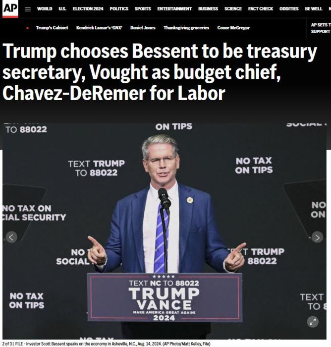 当地时间22日,特朗普宣布,他将提名斯科特·贝森特担任美国财政部长。现年62岁的贝森特为对冲基金经理,支持特朗普的关税政策,也曾担任过索罗斯基金管理公司的首席执行官。