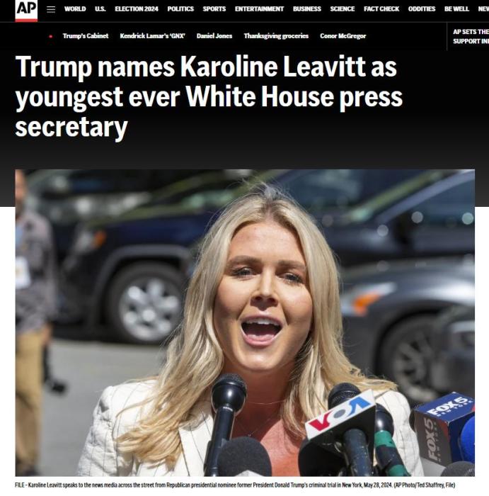 莱维特出生于1997年,或成为20世纪70年代以来最年轻的美国总统新闻发言人。她曾是特朗普2024年大选竞选团队的新闻发言人。在特朗普的上个任期中,曾担任白宫助理新闻秘书。