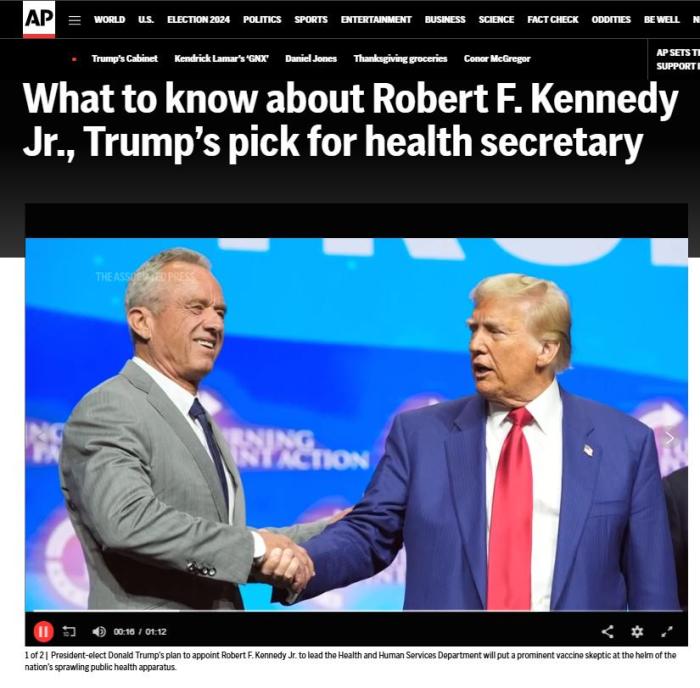 小肯尼迪来自肯尼迪家族,是已故前司法部长、联邦参议员罗伯特·肯尼迪之子,伯父是1963年遇刺身亡的前总统约翰·肯尼迪。他曾作为独立竞选人参加2024年美国总统选举,后宣布暂停竞选,转而支持特朗普。他是知名的反疫苗活动家,因此特朗普的这一任命也引起了美国舆论特别是公共卫生领域专家的担忧和质疑。