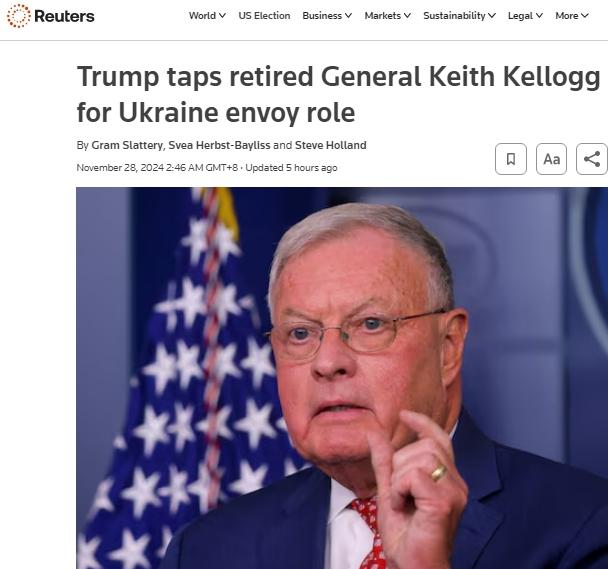 中新网11月28日电 据路透社报道,当地时间11月27日,美国当选总统特朗普在社交媒体平台上表示,他将选择基思·凯洛格担任乌克兰危机问题特使。