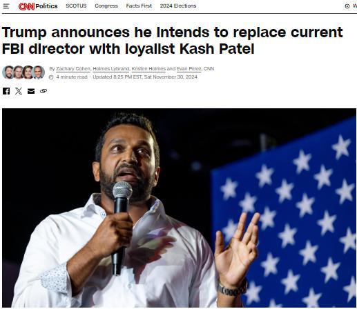 中新网12月1日电 综合美媒报道,当地时间11月30日,美国当选总统特朗普在社交媒体上宣布,他将提名卡什·帕特尔(Kash Patel)担任美国下一任联邦调查局(FBI)局长。