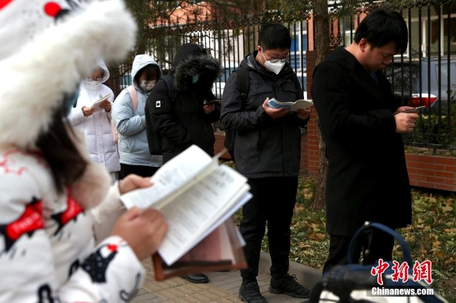 资料图:2023年11月26日,北京第十二中学校本部考点外,考生在入场前复习。中新社记者 易海菲 摄