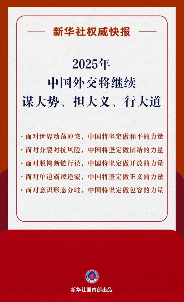 12月17日2024年国际形势与中国外交研讨会在北京举行外交部介绍,2025年中国外交将继续谋大势、担大义、行大道 面对世界动荡冲突,中国将坚定做和平的力量面对分裂对抗风险,中国将坚定做团结的力量面对脱钩断链行径,中国将坚定做开放的力量面对单边霸凌逆流,中国将坚定做正义的力量面对意识形态分歧,中国将坚定做包容的力量 记者:刘杨、邵艺博设计:刘杨新华社国内部出品 上一篇 下一篇