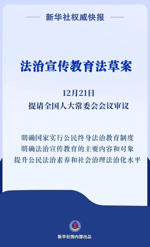 法治宣传教育法草案12月21日提请全国人大常委会会议审议。草案共7章62条,包括总则、社会法治宣传教育、国家工作人员法治宣传教育、青少年法治宣传教育、保障与监督、法律责任和附则,明确国家实行公民终身法治教育制度,明确法治宣传教育的主要内容和对象。