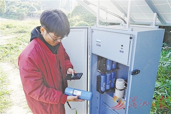 12月22日清晨,木兰陂水利风景区,一台由太阳能系统供电的水质智能采样器立于木兰溪畔,2名采样员通过手机App进行位置签到后,点击“开始采样”。溪水经过采样器,被抽进了采样瓶。采样员将一张标签贴于瓶身,并扫码绑定,将信息录入系统。