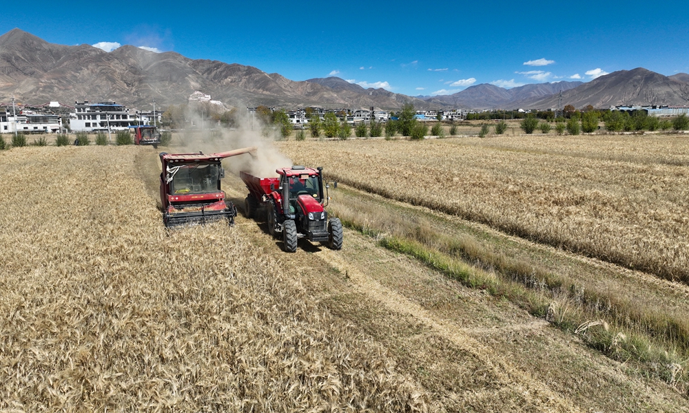 2024年10月16日,西藏日喀则市江孜县江热乡班觉伦布村农机服务农民专业合作社的社员使用农机收获青稞(无人机照片)。新华社记者 晋美多吉 摄