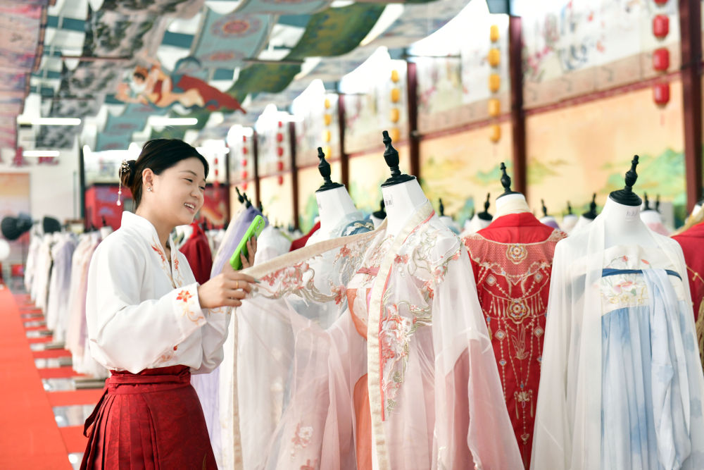 2024年9月27日,在山东曹县大集镇一家汉服基地,主播直播推介汉服。新华社记者 郭绪雷 摄