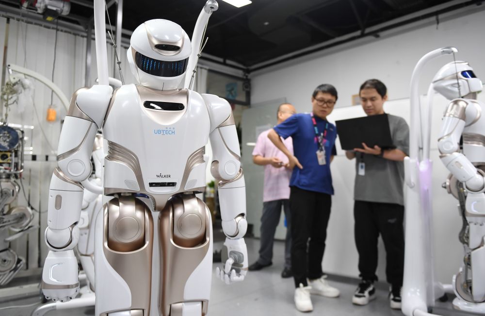 2024年6月26日,在位于深圳市南山区智园的优必选总部,工作人员对人形机器人进行测试。新华社记者 毛思倩 摄