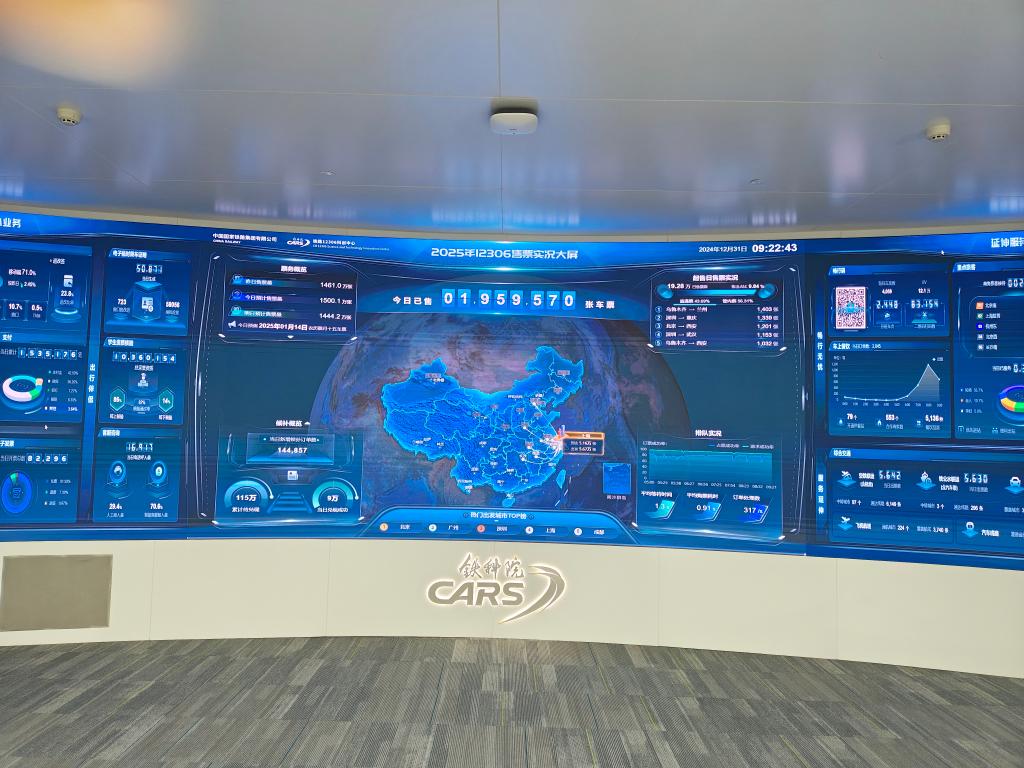 春运火车票发售首日,铁路12306监控大屏上,已售车票数字不断刷新。截至9点30分,铁路12306共售出春运火车票19.50万张,占当日售票总数的9.46%。其中,乌鲁木齐—兰州、深圳—重庆、北京—西安三个区段春运火车票最火热,售票分别达到1420张、1355张和1210张。