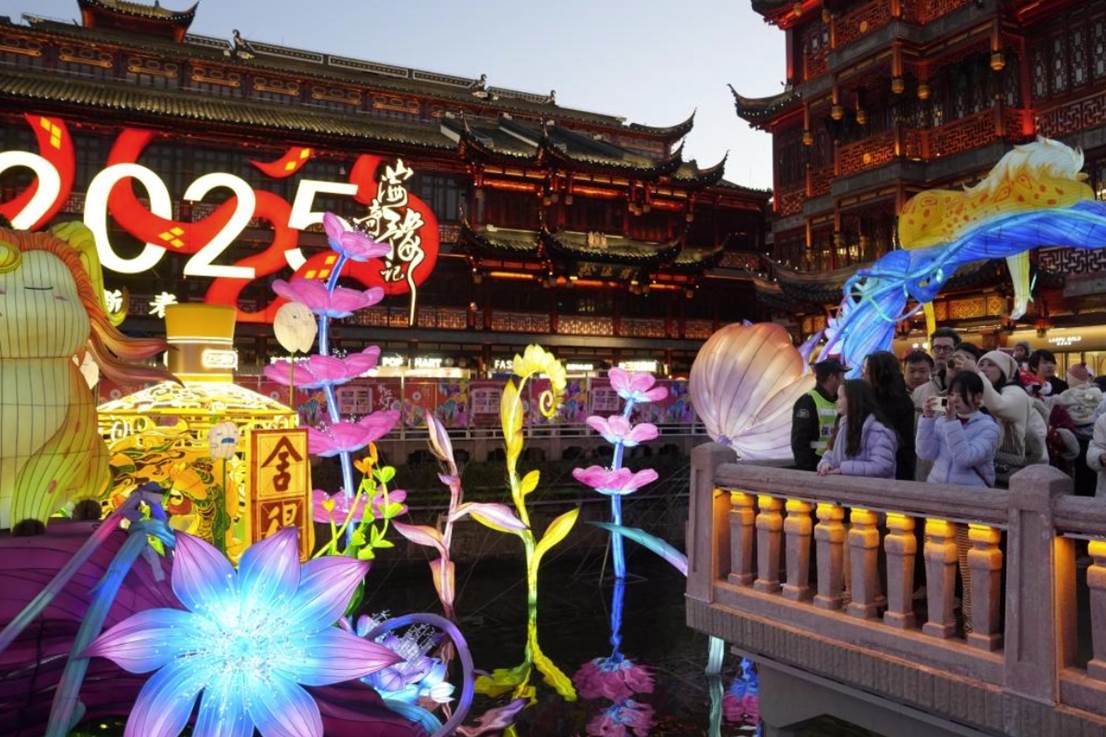 2025年1月1日,人们在豫园九曲桥上赏灯。新华社记者 刘颖 摄