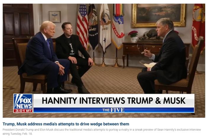 据福克斯新闻网报道,近期一些媒体和民主党将矛头指向马斯克,称他通过“政府效率部”“篡权”,并给他贴上“总统马斯克”的标签。主持人在采访中称,这些批评是为“离间”两人,让他们“互相憎恨”。