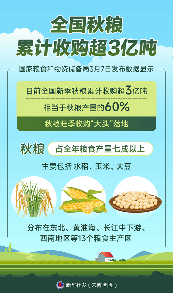 新华社北京3月7日电(记者王立彬)国家粮食和物资储备局7日发布数据显示,目前全国新季秋粮累计收购超3亿吨,相当于秋粮产量的60%,秋粮旺季收购“大头”落地。