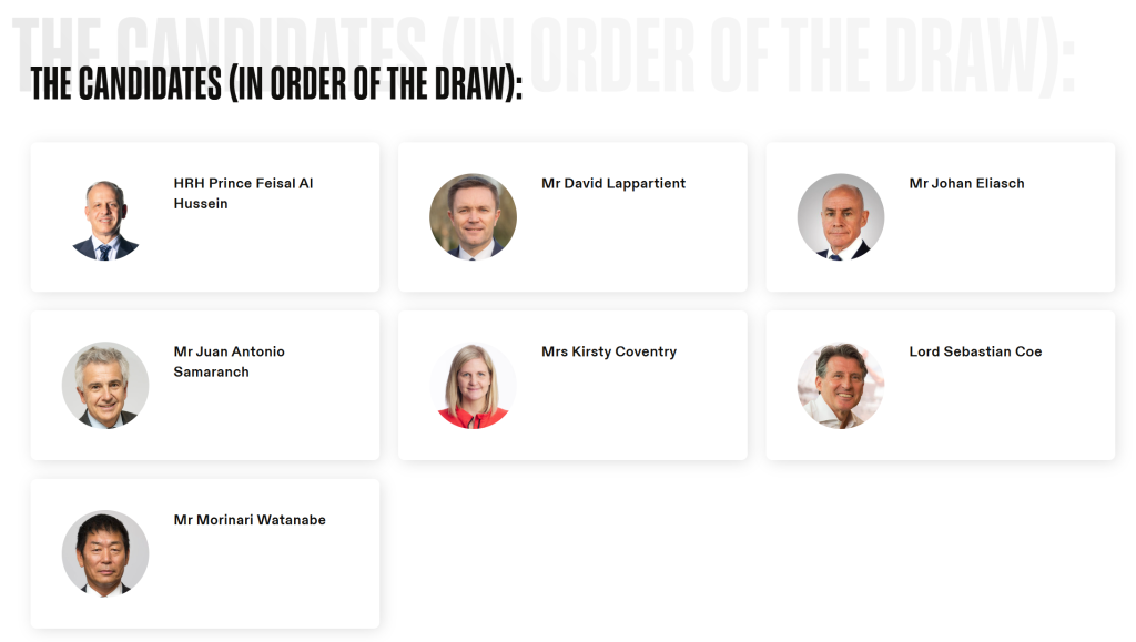 此次国际奥委会主席选举共有创纪录的七人参与,包括国际奥委会副主席小萨马兰奇,国际奥委会执委、运动员委员会前主席柯丝蒂·考文垂,世界田联主席塞巴斯蒂安·科,国际自行车联盟主席大卫·拉帕尔蒂安,国际雪联主席约翰·埃利亚施,国际奥委会执委费萨尔·侯赛因和国际体操联合会主席渡边守成。