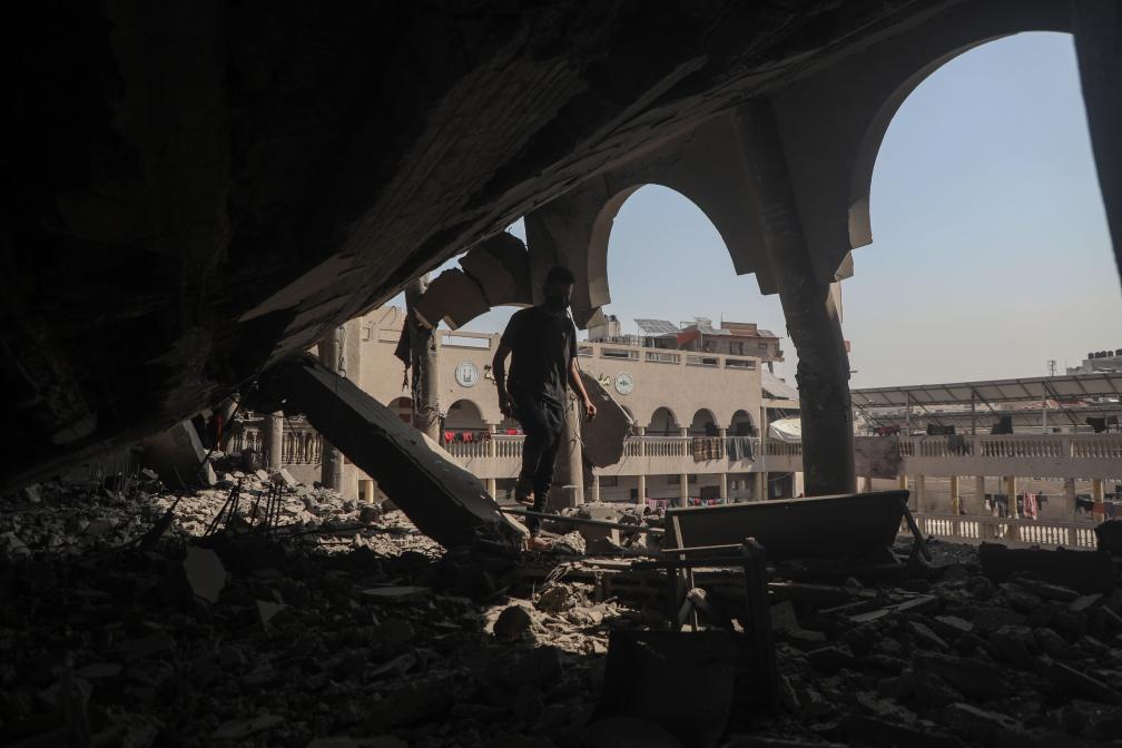 3月18日,在加沙地带北部加沙城的一处社区,一名男子查看遭以军空袭损毁的建筑。新华社发(里泽克·阿卜杜勒贾瓦德摄)