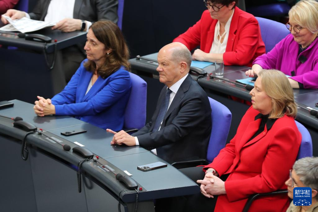 3月25日,在德国柏林,朔尔茨(中)出席新一届德国联邦议院首次全体会议。新华社记者 杜哲宇 摄