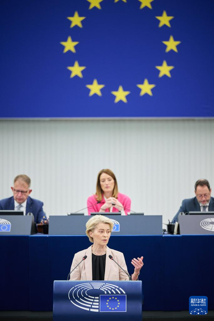 4月1日,欧盟委员会主席冯德莱恩在法国斯特拉斯堡举行的欧洲议会全会上讲话。新华社发(欧盟供图)