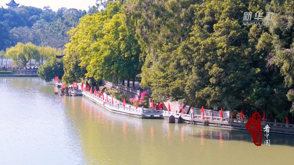 冶山春秋园中,木棉开得明艳,宛如为灰瓦白墙点亮了一盏灯。左海湖水泛着细碎金光,榕须垂落,漾开一圈圈年轮般的涟漪。