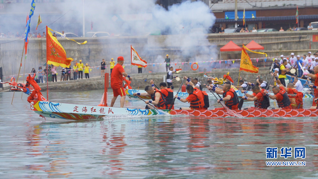 海上赛龙舟,是定海村的传统盛事,祈愿风调雨顺、幸福安康。新华网 肖和勇 摄