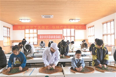 坦洋茶场内,学生在体验坦洋工夫制作技艺。李郁 摄