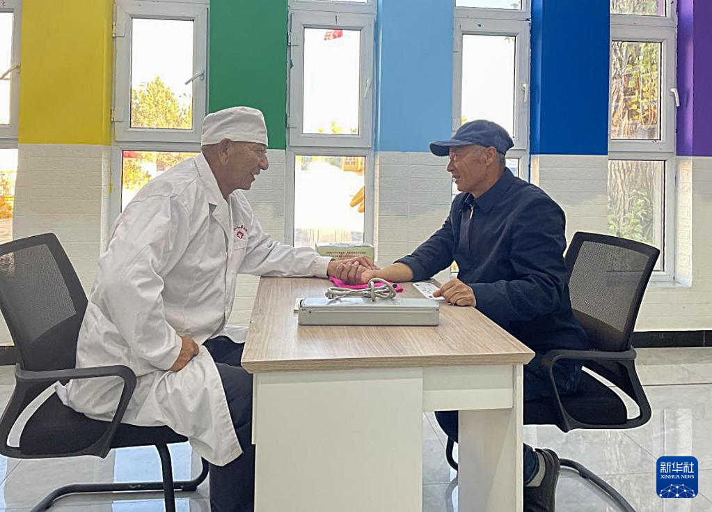 新疆维吾尔自治区阿勒泰地区福海县医生毛里夏里甫·哈帕(左)在问诊。新华社发