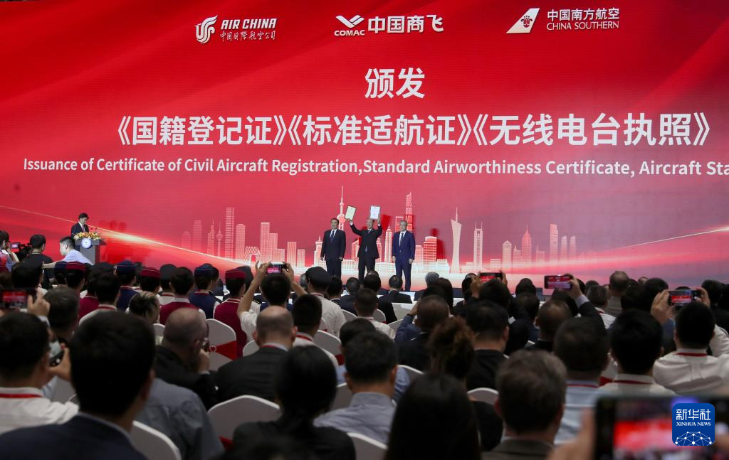 交付活动现场,中国商飞向国航、南航颁发飞机销售证并移交飞机交付纪念钥匙。中国民航局向国航、南航颁发国籍登记证、单机适航证和无线电台执照。