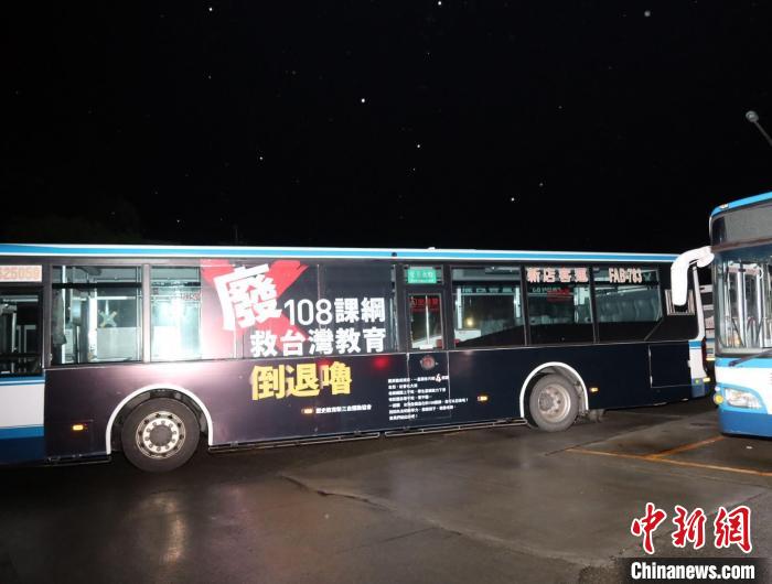 11月21日起,台北4条公交路线多辆公交车的车身上投放了呼吁废除现行课纲的广告。(受访者供图)