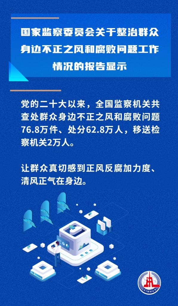 党的二十大以来,全国监察机关查处群众身边不正之风和腐败问题76.8万件、处分62.8万人,移送检察机关2万人……