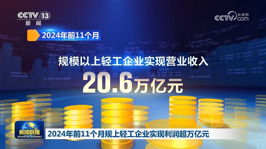 记者从中国轻工业联合会获悉,2024年前11个月,我国轻工行业生产平稳增长,规模以上轻工企业实现利润超万亿元。