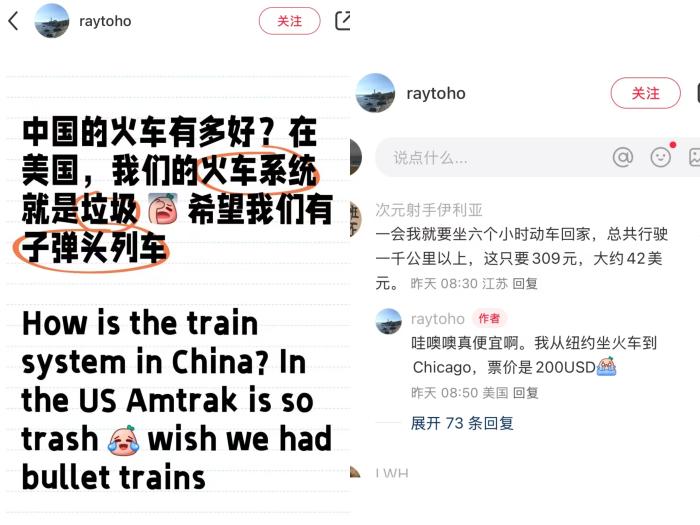 美国网友raytoho发帖问:中国的高铁有多好?一位中国网友回复说:“一会我就要坐6小时动车回家,总共行驶1000多公里,只要309元,大约42美元。”听到票价,这位发帖的美国网友破防了,他感叹“真便宜啊。我从纽约坐火车到芝加哥(大约1200多公里),票价是200美元。”
