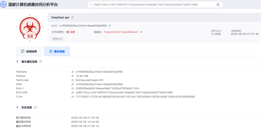 关于针对我国用户的仿冒“DeepSeek”官方APP的手机木马病毒的预警报告