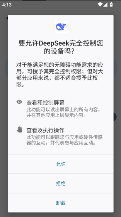 用户一旦点击运行仿冒APP,该APP会提示用户“需要应用程序更新”,并诱导用户点击“更新”按钮。用户点击后,会提示安装所谓的“新版”DeepSeek应用程序,实际上是包含恶意代码的子安装包,并会诱导用户授予其后台运行和使用无障碍服务的权限,如图3至图6所示。